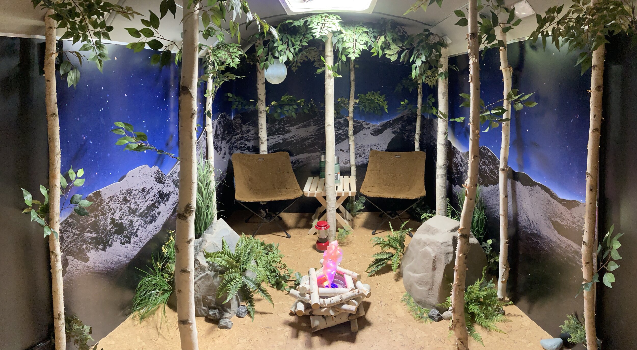 When this client called asking us to install a podcast studio into a retired airport shuttle van, we said yea sure… When they told us they wanted to deck it out to look like a campsite, we totally got onboard!