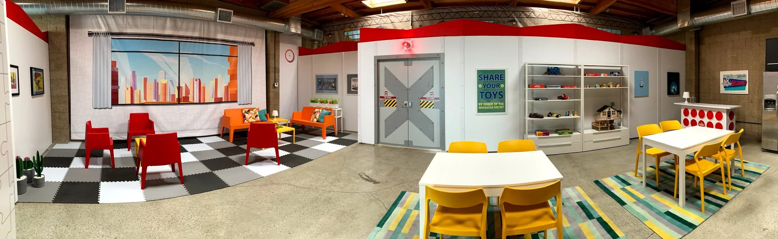 ADF was contracted to fabricate a toy lab in an empty warehouse. due to covid most trade shows canceld this year, so this company came up with The Brilliant idea to bring the clients to them. every inch of this Space was expertly themed, Custom bar, Game wall Featuring many of the company’s products, Custom boardroom table, giant tv surrounds, the list just keeps going!